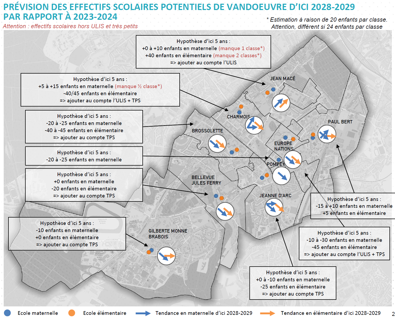 - L’identification des évolutions démographiques et des perspectives d’évolution des effectifs scolaires selon les quartiers à horizon +5 ans.